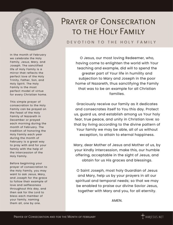 This simple prayer of consecration to the Holy Family can be prayed on the Feast of the Holy Family of Nazareth in December or prayed each morning during the month of February. The tradition of honoring the Holy Family each year during the month of February is a great way to pray with and for your family with the help of the intercession of the Holy Family.